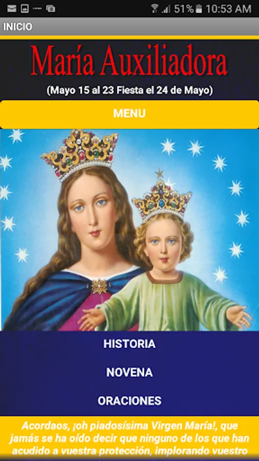 In this application you can see the history of devotion to the Blessed Virgin in her invocation of María Auxiliadora of Christians, the ninth and some prayers.