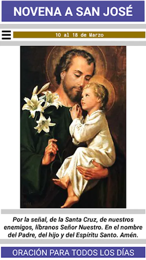 In this application you will find the novena to our beloved Patriarch Saint Joseph, putative father of Jesus and husband of the Blessed Virgin Mary. Ask him confidently and with all your heart that he will listen to you.