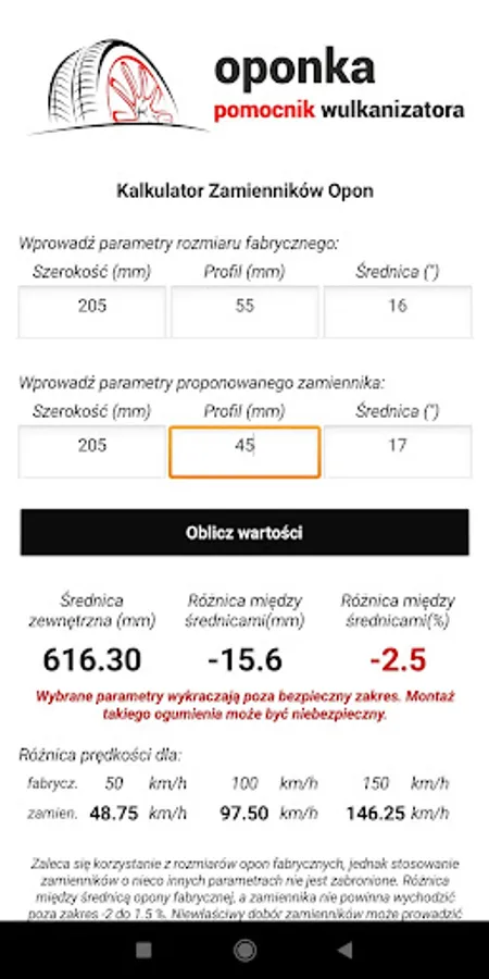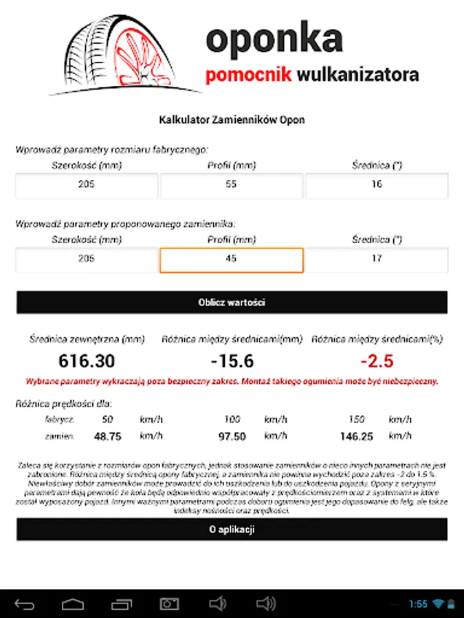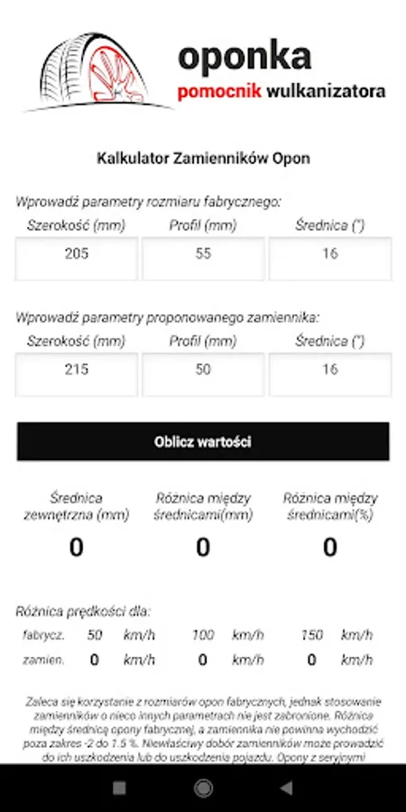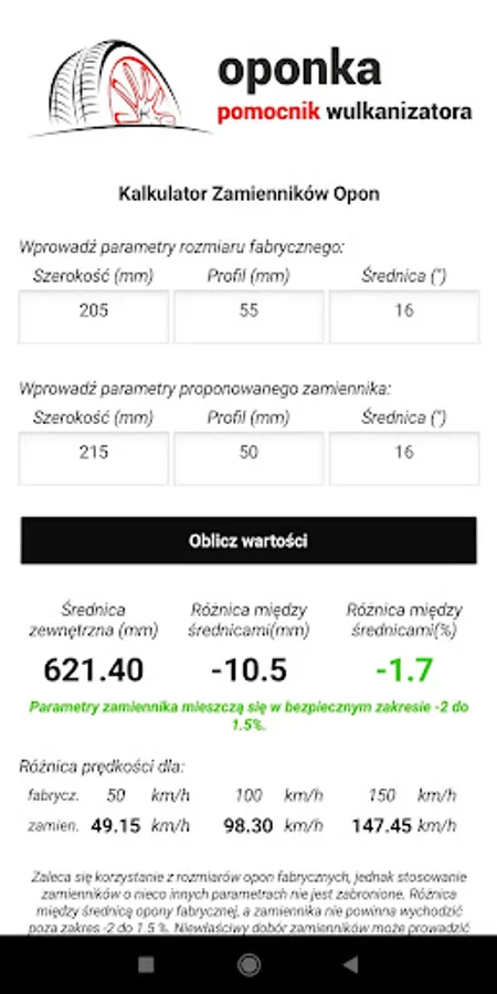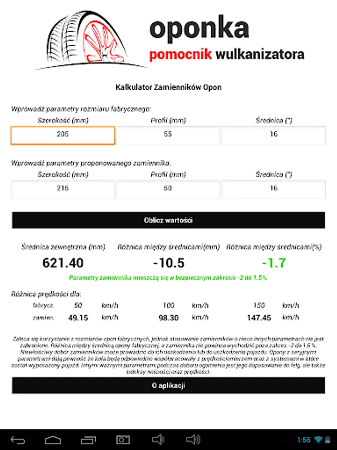 Application supporting work in vulcanization plants, but not only. Are you passionate about tuning cars, wondering what wheel sizes should land in your car? Sounds trivial? Hmm .. well, probably nothing else. The process of selecting tires with the right parameters is not so simple ... To make everything play properly, you need to make some calculations. Remember that fitting wheels too small or too large in diameter can cause false readings of the car meter while driving, in addition, the wrong choice of tires can cause an increase in combustion. The application will relieve you to some extent and partly show you in which direction you should go. The phenomenon of the application is to quickly calculate and write a message whether a replacement with the given parameters is suitable for your car or not, your task is only to enter the value of the recommended factory wheels and provide the parameters of the replacements you are interested in, the rest is on the application side. The application will, if possible, be expanded with other useful things. Application tips and opinions are welcome.
