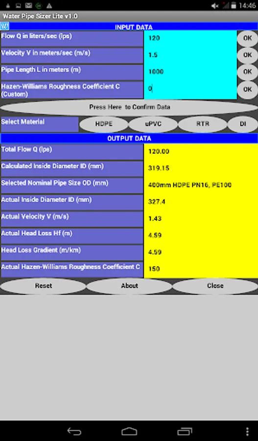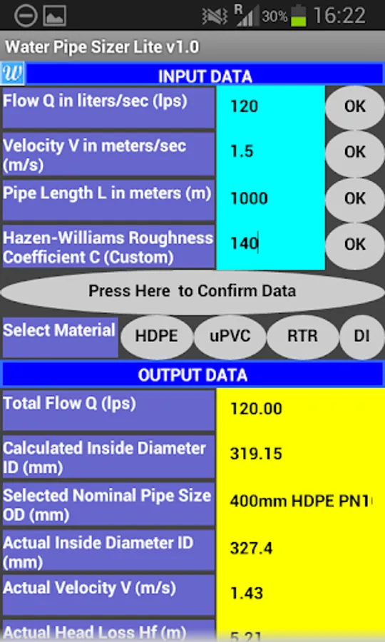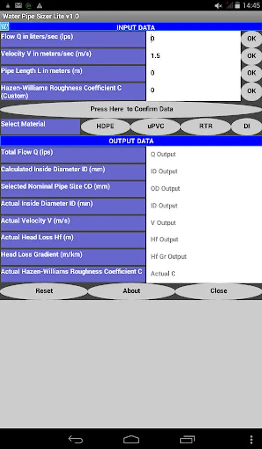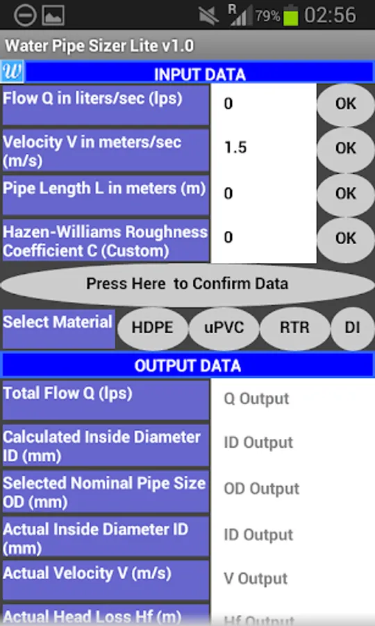It is assumed that the design flow in liters per second is already available for a particular pipe. The figure for design flow can be encoded manually. In the “Flow Q in liters/sec (lps)” data field, encode the design flow and press the “OK” button to add the data in the system. Encode the other relevant data for design velocity, length of pipe and Hazen-Williams friction loss coefficient C for the required pipe material. The default value of C is 0 for automated selection of the C value according to material type. The default can be overridden by encoding a required value not more than 150. Change it according to pipe material requirement or according pipe age. Press the corresponding OK button after encoding each data figure and press the “Press here to confirm data” button. To size the pipe, press the required pipe material button. The output will be displayed in the corresponding data fields at the right column. The reset button clears all variables and input/output data.