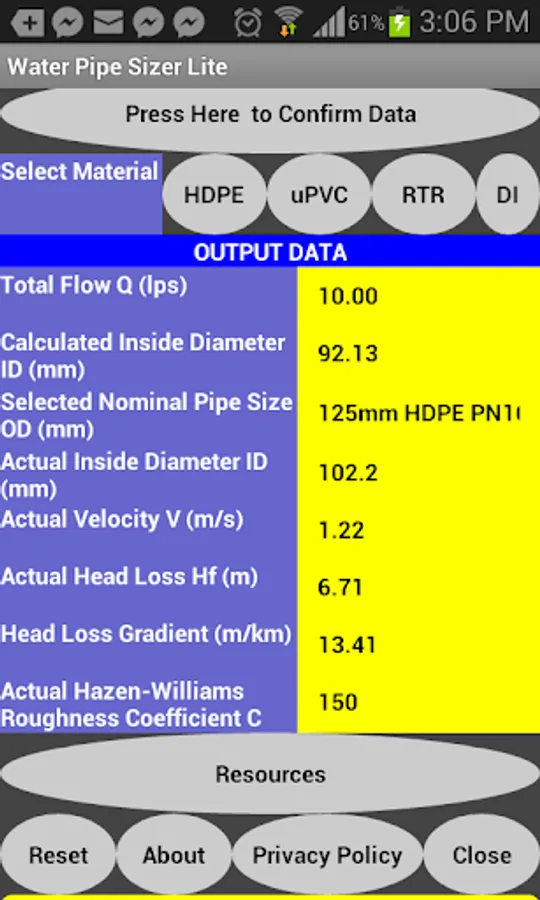 Algorithms used in this Water Pipe Sizer Lite are based on principles of hydraulics for pressure pipes. Pipe sizing calculation is based on the discharge/continuity formula Q=AV, where Q = flow rate in liters per second, A = cross sectional area of pipe in millimeters, and V=velocity of water in the pipe . Head loss calculation is based on Hazen-Williams friction loss equation Hf=10.7*L*(Q/C)^1.85/D^4.87 where Hf =friction loss in meters, L=pipe length in meters, C=Hazen-Williams friction loss coefficient, and D=diameter of pipe in millimeters. Pipe sizes are based on standard specifications for the following materials: Ductile Iron (DI), IS0 2531, BSEN 545 & 598; Reinforced Thermosetting Resin / Fiberglass (RTR, GRP, GRE, FRP), AWWA C950-01; High Density Polyethylene (HDPE), SDR11, PN16, PE100; uPVC, PN16, Class 5, EN12162, ASTM1784. Inside pipe diameter or nominal bore for other standards may differ and not included in the built-in catalogues in this application. However, the user can still use the app to determine the required internal diameter for other pipes of different pressure classes and refer to corresponding pipe catalogues for standard nominal pipe diameter selection.