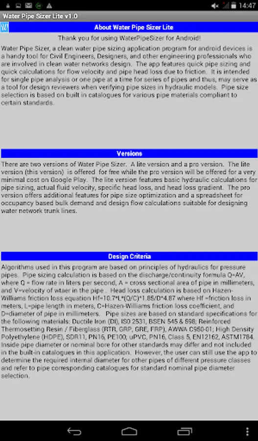 Water Pipe Sizer Lite, a clean water pipe sizing application program for android devices is a handy tool for Civil Engineers, Designers, and other engineering professionals who are involved in clean water networks design. The app features quick pipe sizing and quick calculations for flow velocity and pipe head loss due to friction. It is intended for single pipe analysis or one pipe at a time for series of pipes and thus, may serve as a tool for design reviewers when verifying pipe sizes in hydraulic models. Pipe size selection is based on built in catalogs for various pipe materials compliant to certain standards.