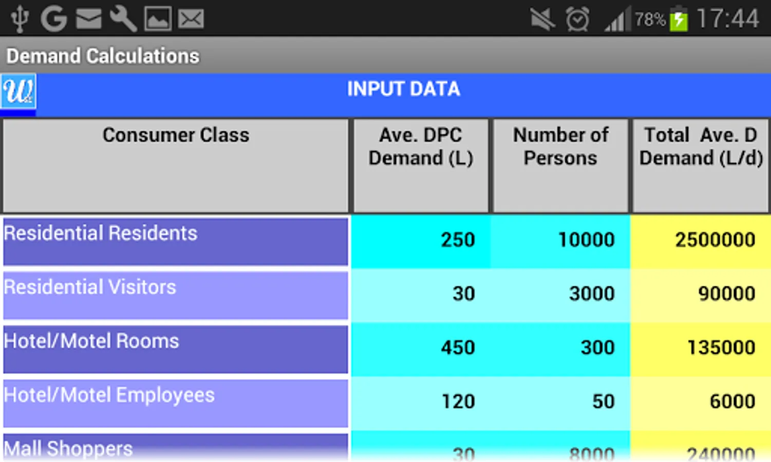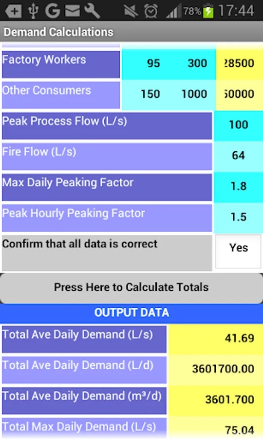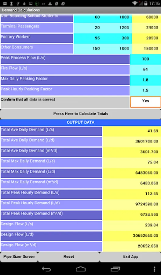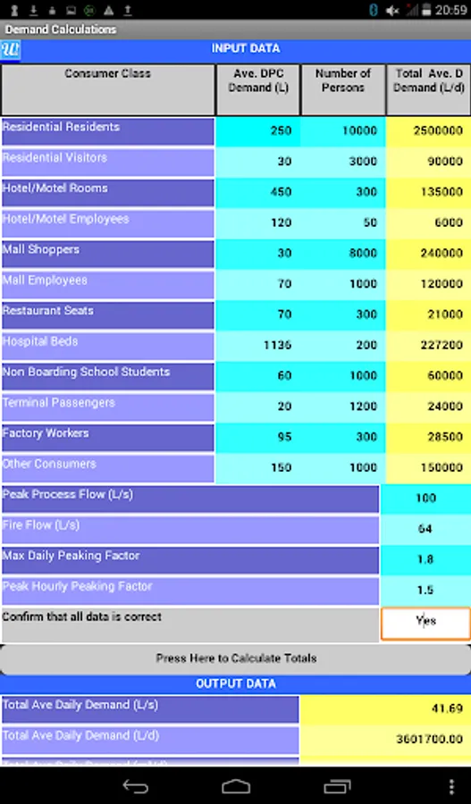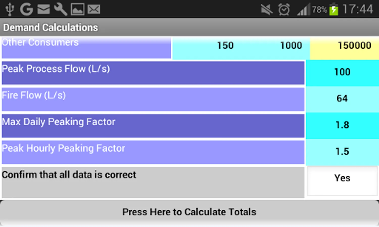 Potable water, irrigation and fire water requirements vary according to geographic location, local standards and regulations. The user is assumed to be skilled in calculating design demands, flow in pipes and pressure loss based on local design criteria mandated by local authorities. The user is responsible in checking the accuracy of his/her own work and solely responsible for the results obtained from using this application.