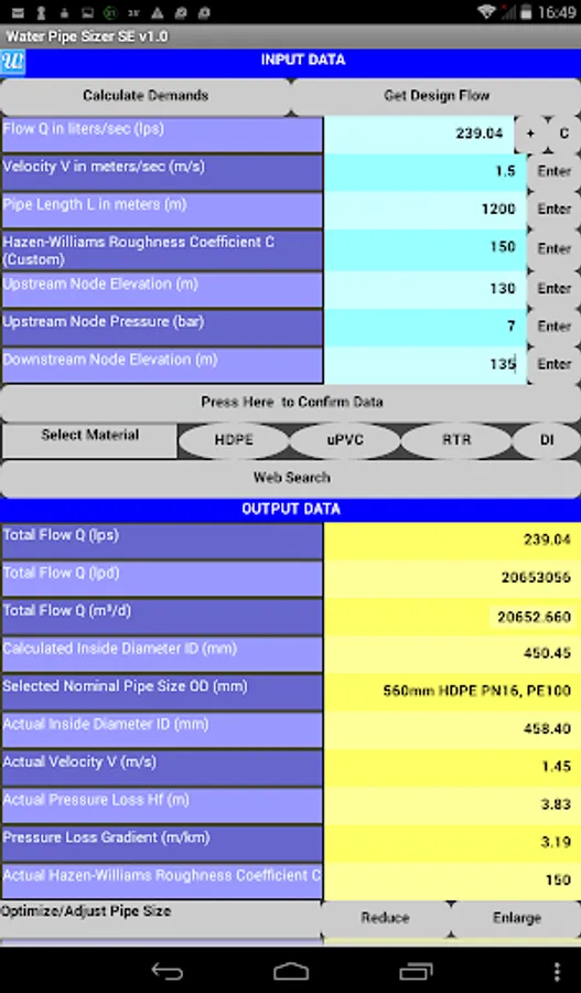 Water Pipe Sizer SE, a clean water pipe sizing application program for android devices is a handy tool for civil engineers, designers, and other engineering professionals who are involved in clean water networks design. The app features quick pipe sizing and quick calculations for flow velocity and pipe head loss due to friction. It is intended for single pipe analysis or one pipe at a time for series of pipes and thus, may serve as a tool for design reviewers when verifying pipe sizes in hydraulic models. Pipe size selection is based on built in catalog for various pipe materials compliant to certain standards.