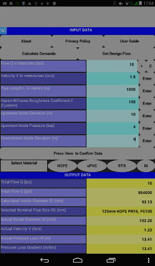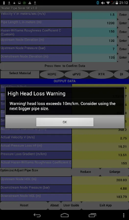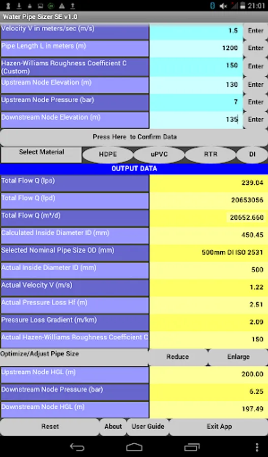Pipe sizes are based on standard specifications for the following materials: Ductile Iron (DI), IS0 2531, BSEN 545 & 598; Reinforced Thermosetting Resin / Fiberglass (RTR, GRP, GRE, FRP), AWWA C950-01; High Density Polyethylene (HDPE), SDR11, PN16, PE100; uPVC, PN16, Class 5, EN12162, ASTM1784. Inside pipe diameter or nominal bore for other standards may differ and not included in the built-in catalogues in this application. However, the user can still use the app to determine the required internal diameter for other pipes of different pressure classes and refer to pipe corresponding catalogues for standard nominal pipe diameter selection.