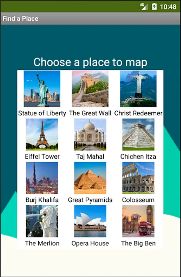 Visit the wonders of the world and famous buildings in this app, learn about their surrounding area, their latitude and longitude. See maps in roads, terrain and aerial views. Also track your current location.