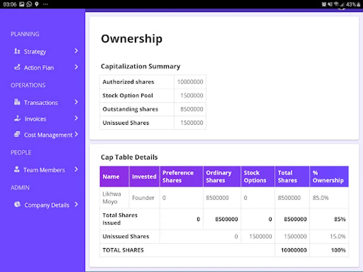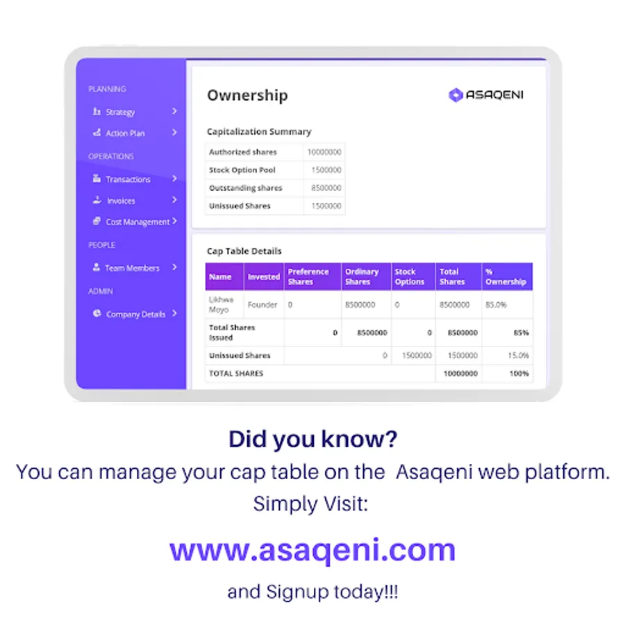 Grow your business with Asaqeni! Our app creates personalized action plans for you to grow your business. You can also manage and monitor all aspects of your business such as recording transactions, creating invoices, managing cap tables and team details.