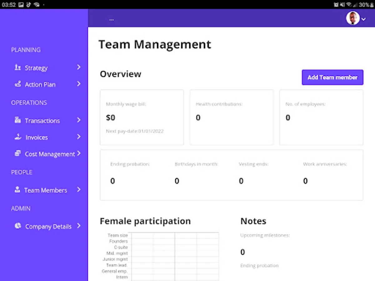 • Manage and monitor all aspects of your business such as recording transactions, creating invoices, managing cap tables and team details