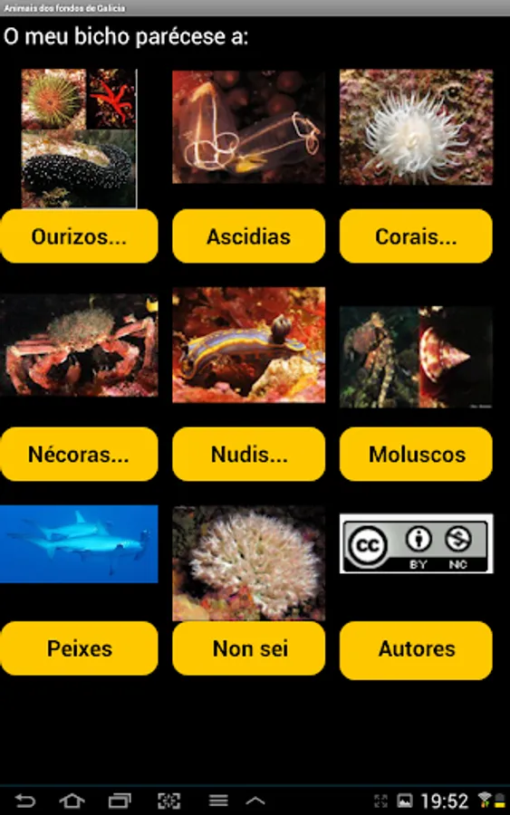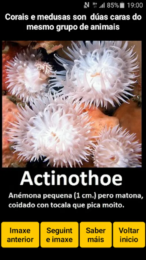 As coasts of Galicia are or dunha fogar huge variedade of animais. With this application, by mergulladores, we want to throw unha man everyone who estea're interested in learning about animais: nomes, costumes ... Coídase or coñece!