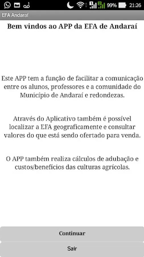 This APP has the function of facilitating communication between students, teachers and the community of the Municipality of Andaraí Area. Through the Application it is also possible to locate the EFA geographically and query values of what is being offered for sale. The application also performs fertilizer calculations and cost / benefit of the crops.