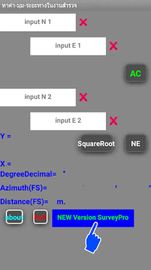 Program (02) is used to calculate the coordinates of the point coordinates N1, E1, and enter the angle (Azimuth) and enter the distance (Distance) is calculated to be hitting the target coordinates N2, E2.