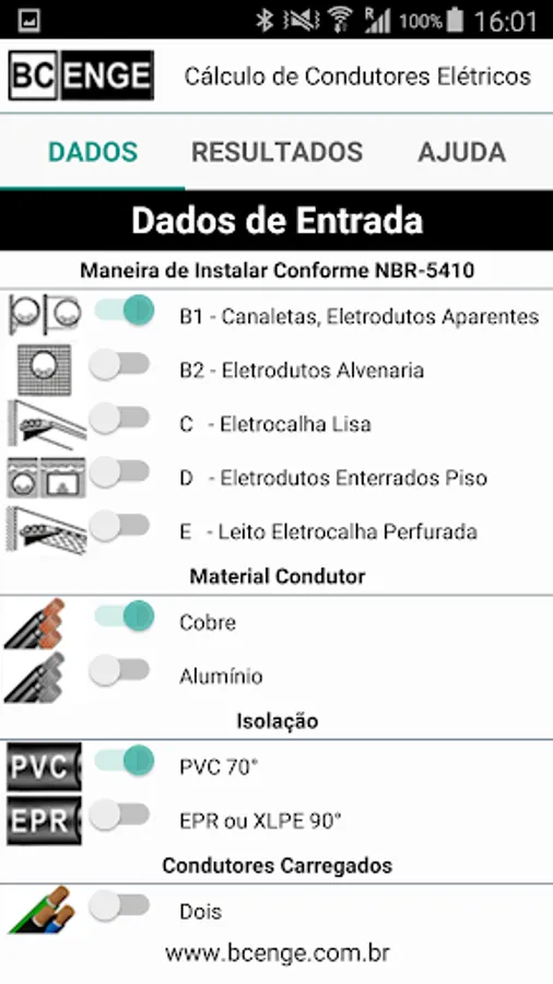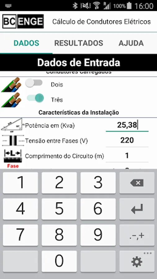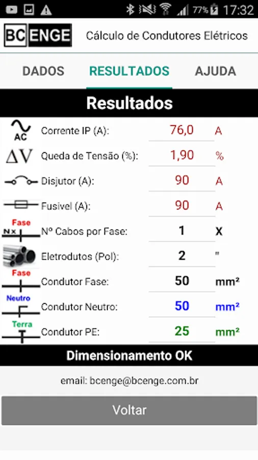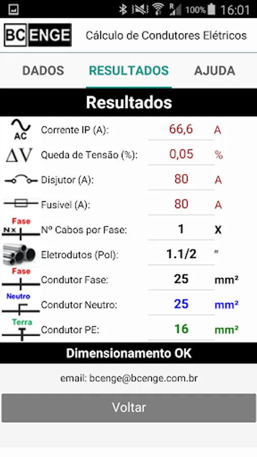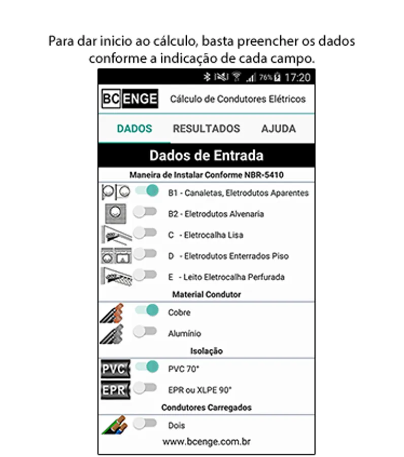 Application for dimensioning electrical conductors and protection, according to the NBR 5410 standard, using the criteria, current conduction and voltage drop, developed by the Bcenge project office.