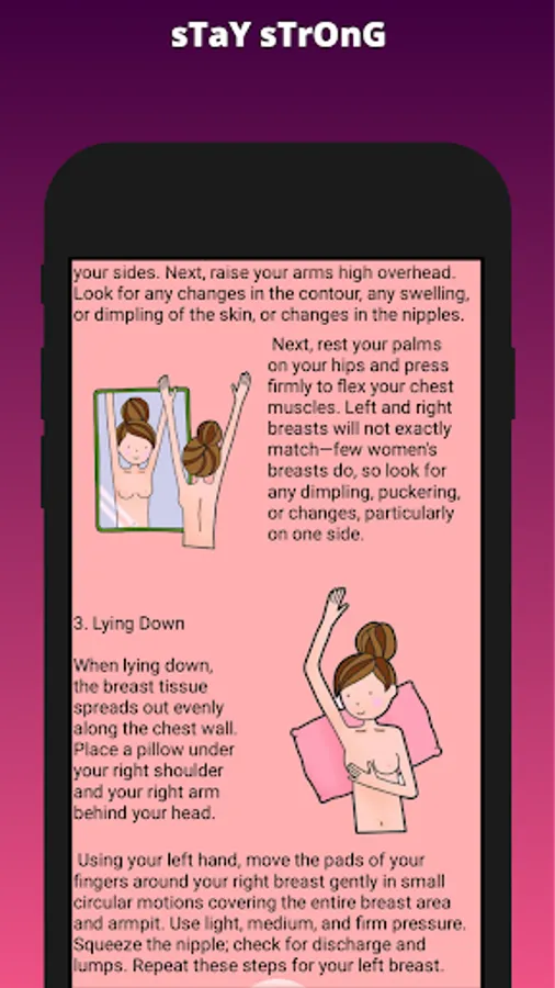 Since Breast Cancer recently is one of most controversial diseases and widespread world wide. Unfortunately many people around us are diagnosed with breast cancer, therefore we thought that focusing on this disease will increase awareness and reduce mortality. The application includes the self-diagnosis that each female can do at home, some advices to follow, as well as listing the sites where people can donate hair for the patients and other organizations for money donation to help and support the sick women.