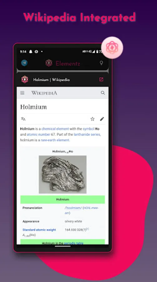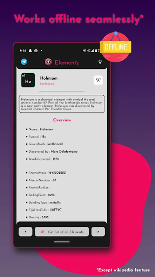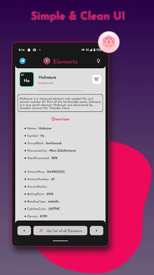 The app has a central information display, where information related to the selected element is shown. A small summary about the element and properties overview as well. Its covers almost every needed property of the element.