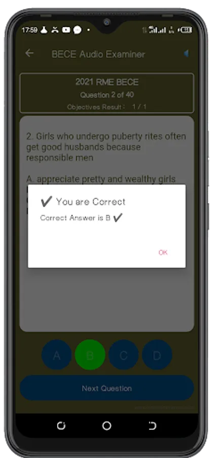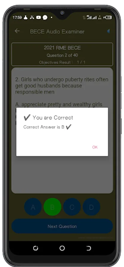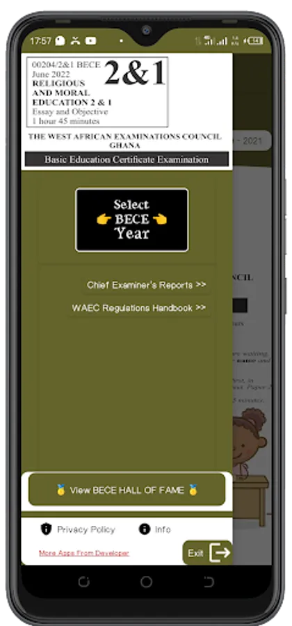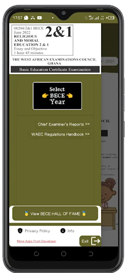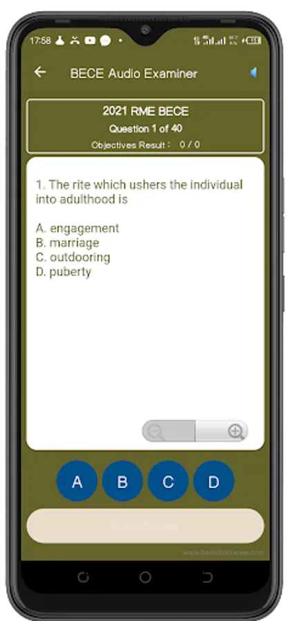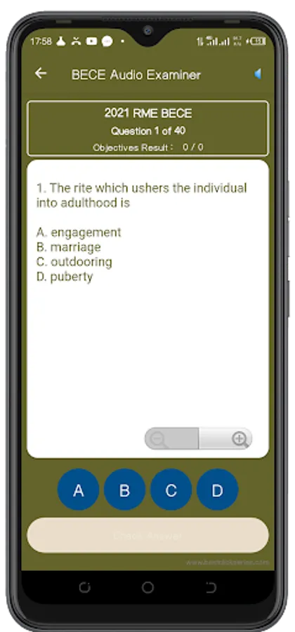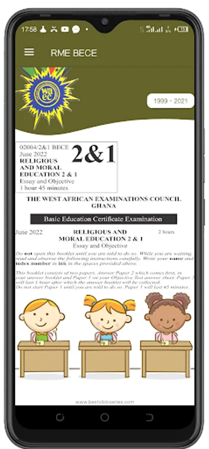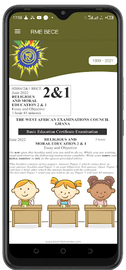 This android quiz app by Best Click Series is used by students / teachers to try 6 years of the past RME BECE on their android device. Actually, students are forced to know the answer to each question before the next question appears with the main reason to make sure that students are able to know the answer to each question in the last 6 years of the past RME BECE questions.