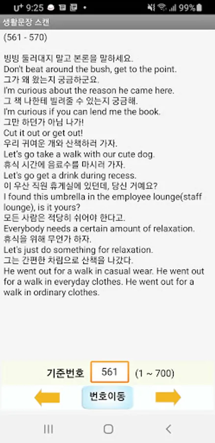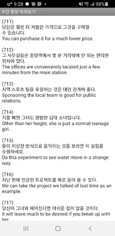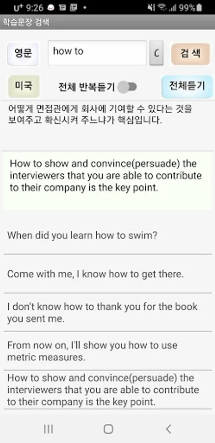 9. Search sentences in English and Korean for the sentences handled in this app, and organize the searched sentences to be repeated sentence by sentence or as a whole, so that you can more efficiently and intensively grasp the use of important words and phrases during the learning process. I made it.