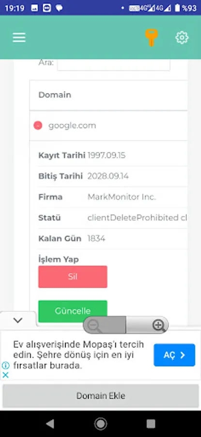 You can list and follow up your domain names in an easy and understandable way with a visually rich table structure that can be sorted. The system, which captures all the information of your domains completely and accurately with its API infrastructure that works practically, has the feature of automatically alerting you with continuous mail and WhatsApp (coming soon) notifications 1 week, 1 month and three months before the expiration date.