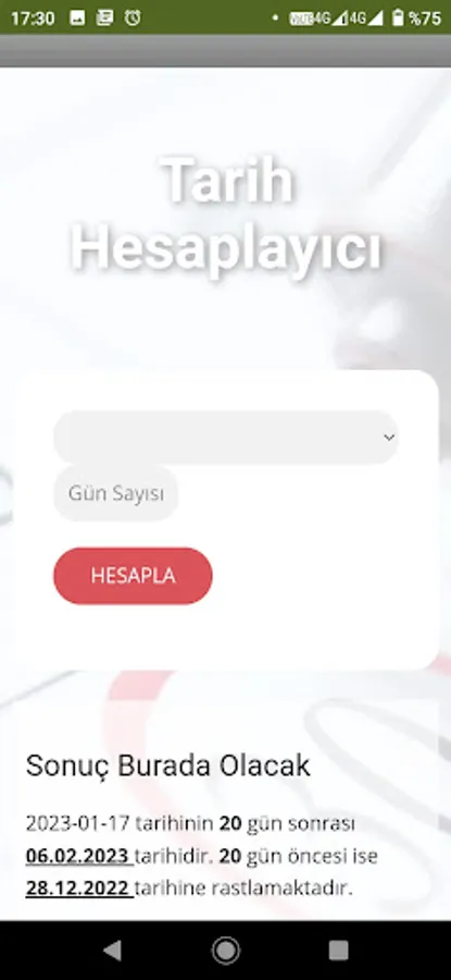 Date Calculator is a simple and practical application for date and day calculation. Select a date and then enter any number as the day value on the numeric data entry screen. The system will instantly calculate and tell you the before and after of the date you select and the day you enter.