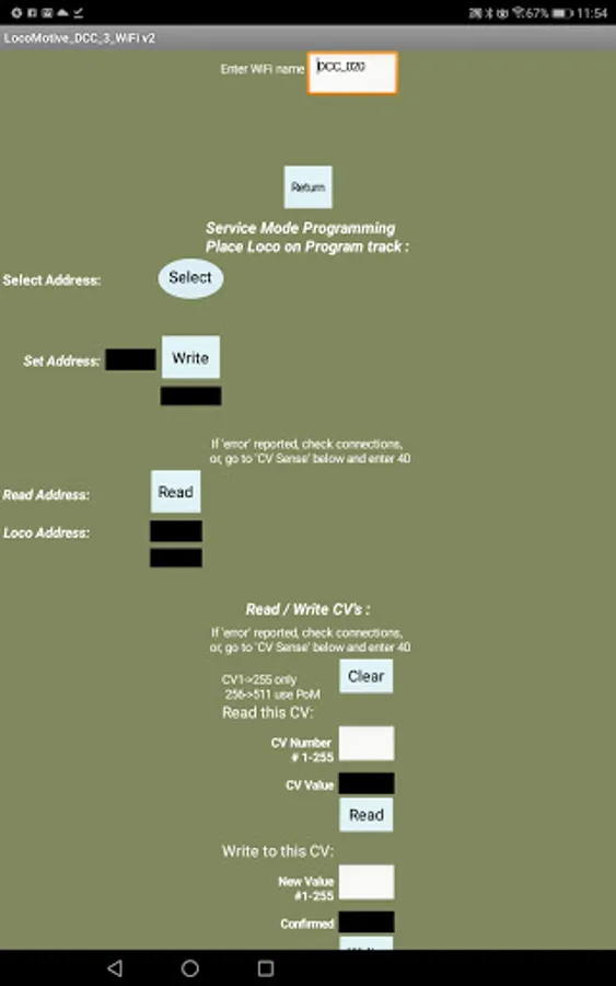 The App formats each DCC packet for transmission via WiFi device (ESP32s) to Arduino Pro Mini connected to a h-bridge to form a simple DCC command station with few parts.