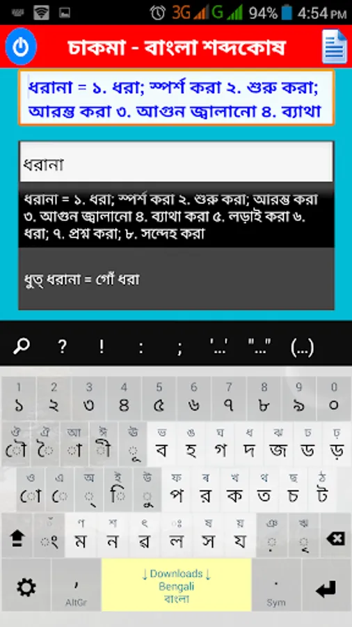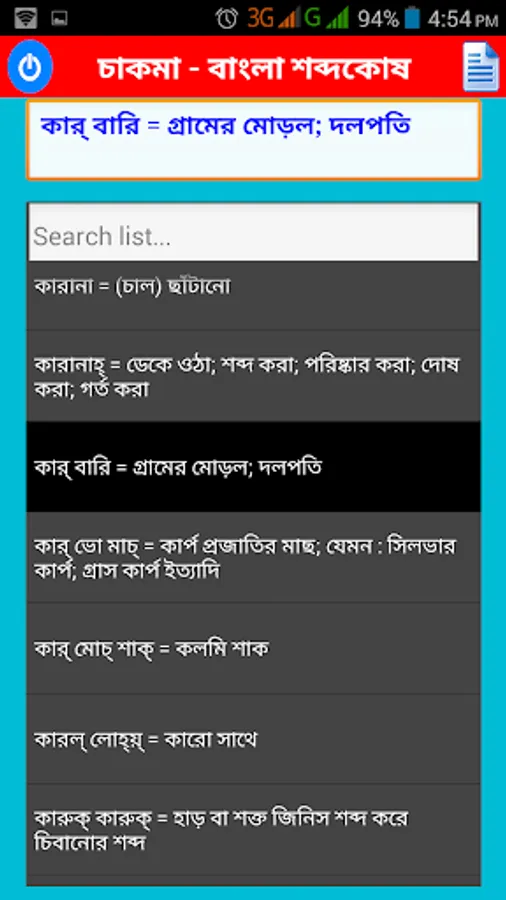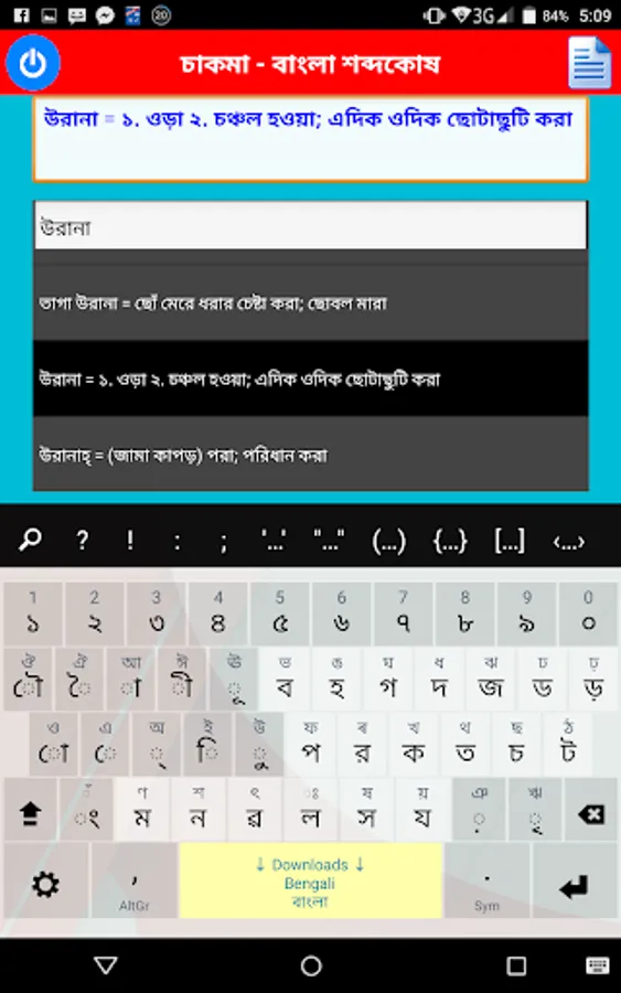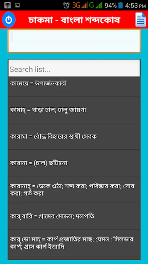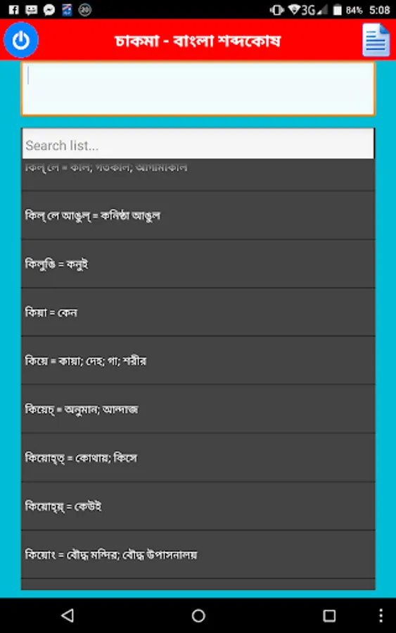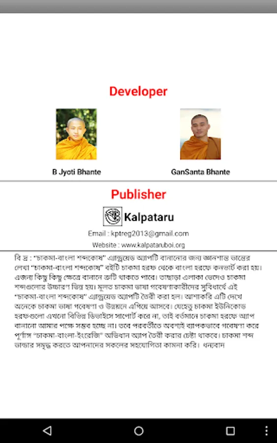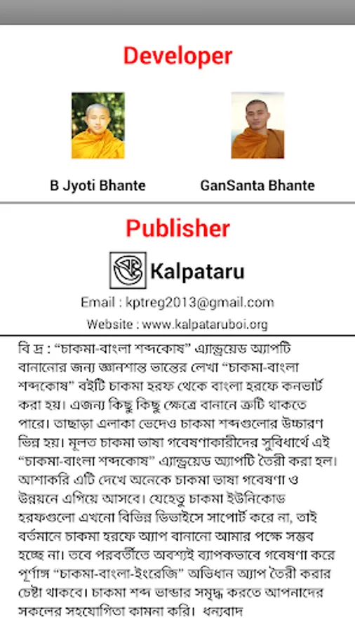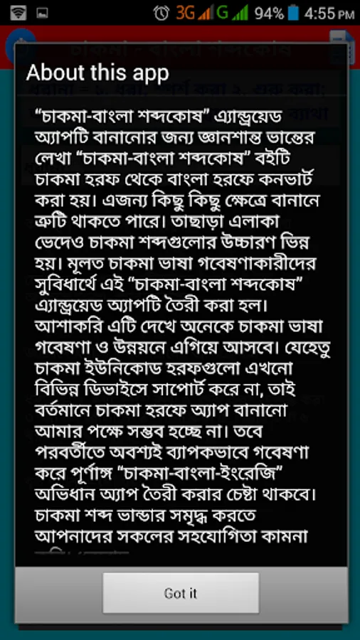 Chakma - Bangla dictionary “চাকমা-বাংলা শব্দকোষ” এ্যান্ড্রয়েড অ্যাপসটি বানানোর জন্য জ্ঞানশান্ত ভান্তের লেখা “চাকমা-বাংলা শব্দকোষ” বা “চাংমা র ভাঙনি” বইটি চাকমা হরফ থেকে বাংলা হরফে কনভার্ট করা হয়। তাই কিছু কিছু ক্ষেত্রে বানানে ত্রুটি থাকাটা অমূলক নয়। তাছাড়া এলাকা ভেদেও (দেজ ভাক্কা পাড়া ভাক্কা) চাকমা শব্দগুলোর উচ্চারণ ভিন্ন ভিন্ন হয়। মূলত চাকমা ভাষা গবেষণাকারীদের সুবিধার্থে এই “চাকমা-বাংলা শব্দকোষ” এ্যান্ড্রয়েড অ্যাপসটি তৈরী করা হল। আশাকরি এটি দেখে অনেকে চাকমা ভাষা গবেষণা ও উন্নয়নে এগিয়ে আসবে। যেহেতু চাকমা ( Changma ) ইউনিকোড হরফগুলো এখনো বিভিন্ন ডিভাইসে সাপোর্ট করে না, এমতাবস্থায় চাকমা হরফে অ্যাপস বানানো আমার পক্ষে সম্ভব হয়ে ওঠছেনা। আশার কথা পরবর্তীতে অবশ্যই ব্যাপকভাবে গবেষণা করে পূর্ণাঙ্গ “চাকমা-বাংলা-ইংরেজি অভিধা” অ্যাপস তৈরী করার চেষ্টা অব্যাহত থাকবে। চাকমা শব্দ ভান্ডার সমৃদ্ধ করতে আপনাদের সকলের সহযোগিতা কামনা রইল। আমাদের এই অ্যাপসটিতে আরো চাকমা শব্দ যুক্ত করতে আমাদের সাথে যোগাযোগ করুন । ধন্যবাদ