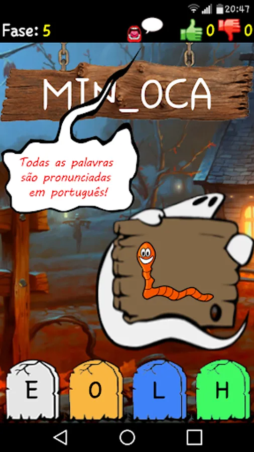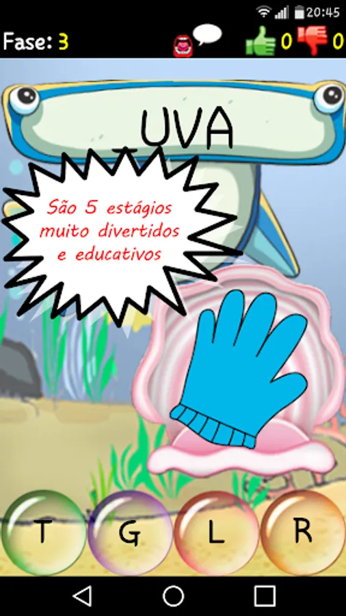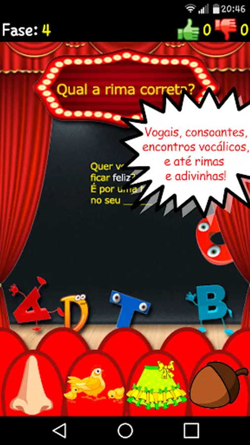 The game as a source of fun and discovery stimulates child learning, and this playful activity the child has access to a colorful and attractive interface, in which it will choose the letrinha to complete the word appears. Each word corresponds to an image and an audio with pronunciation in the human voice. For this role you must have installed the Google Text-to-Speech .