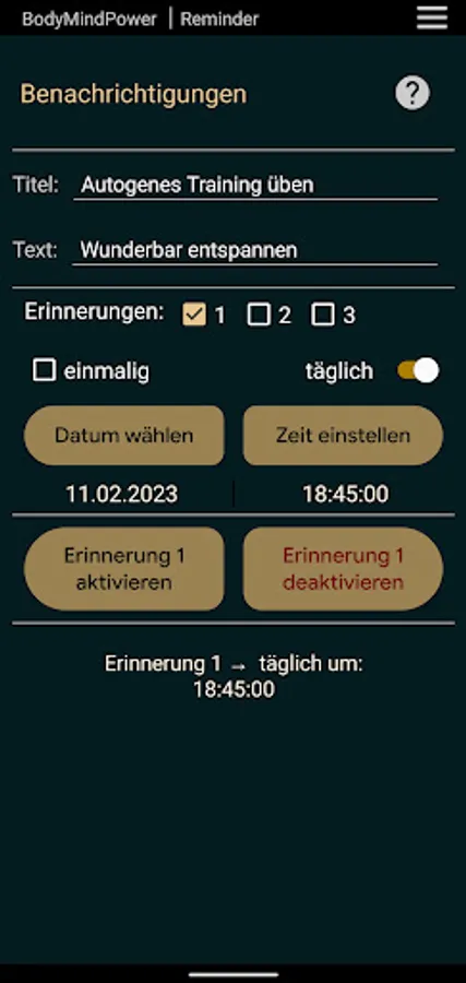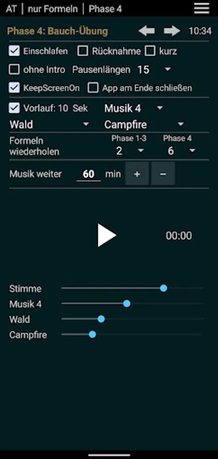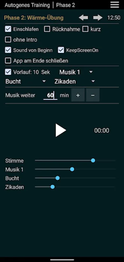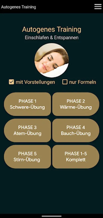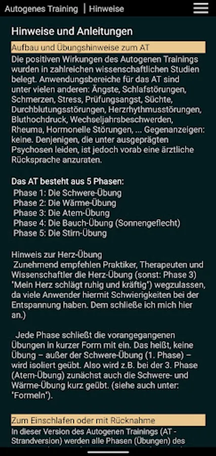 In this app, all phases of the AT and the complete program are taught and practiced. The heart exercise was deliberately left out. This is also recommended by some therapists and scientists, as some practitioners have difficulty relaxing.