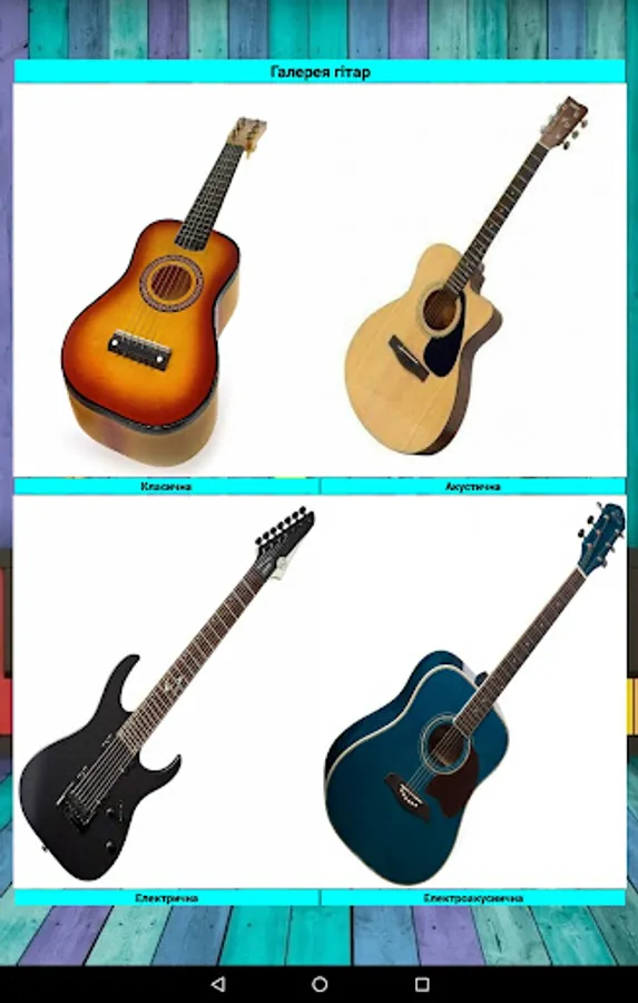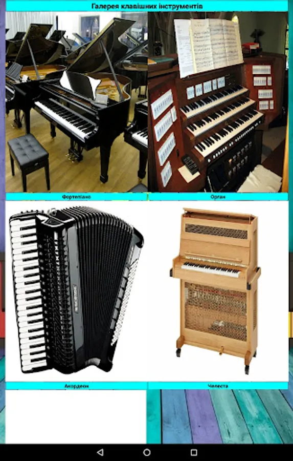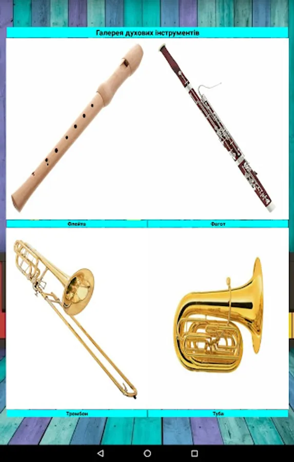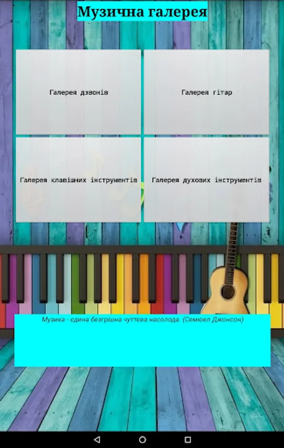 After launching the application, you first need to select the types of instruments you want to hear, then you will be taken to the next page and by clicking on a certain musical instrument, you can hear its sound. There are 4 of them in this version of the application: gallery of bells, gallery of string instruments, gallery of keyboard instruments and gallery of wind instruments. In addition, on the main page you can see quotes from famous people about music. There are only three of them in this version.