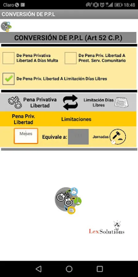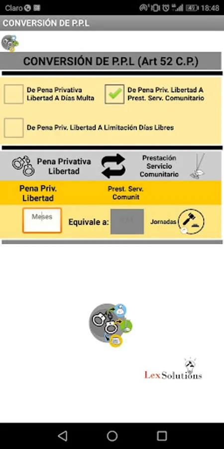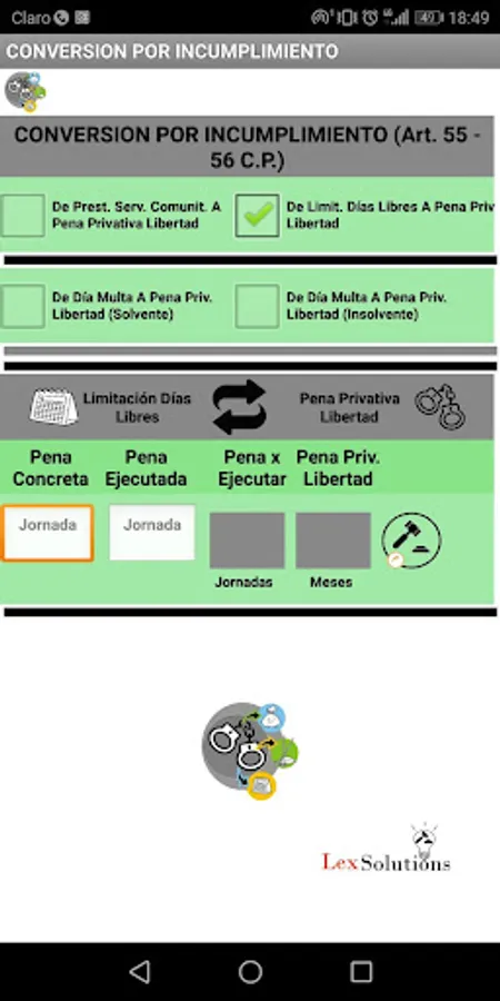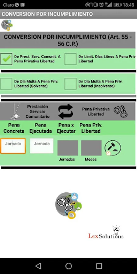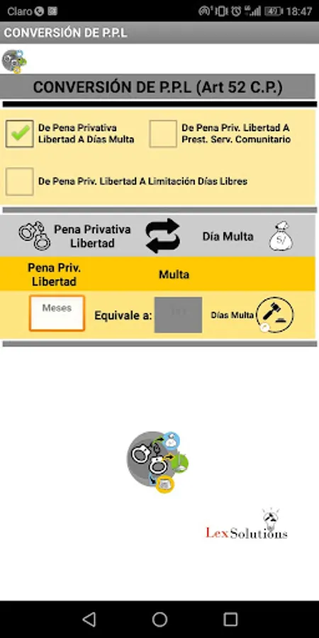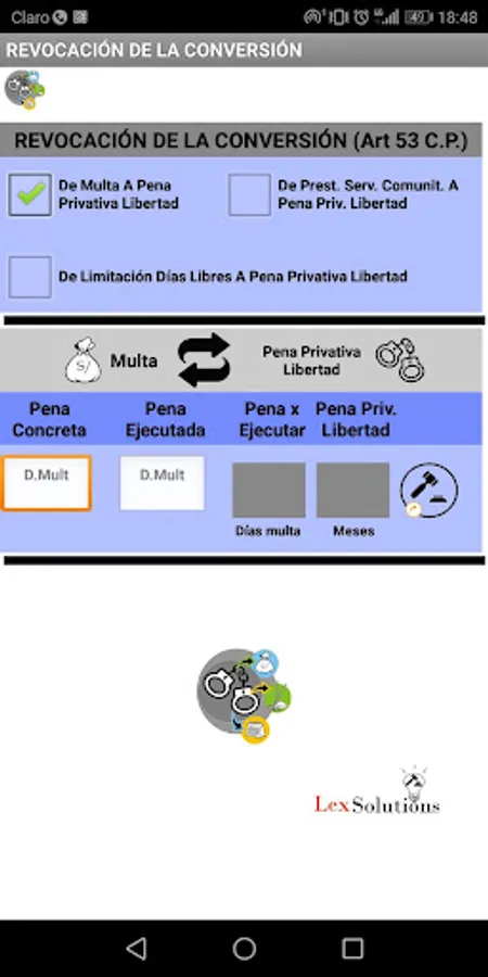 Calculator that converts a Penalty of Liberty into a Fine Day, Provision of Community Services and / or Limitation of Free Days, as well as the Revocation of the Penalty and the Conversion for Non-compliance, in accordance with the provisions of articles 52, 53, 55 and 56 of the Peruvian Penal Code - Legislative Decree No. 635.