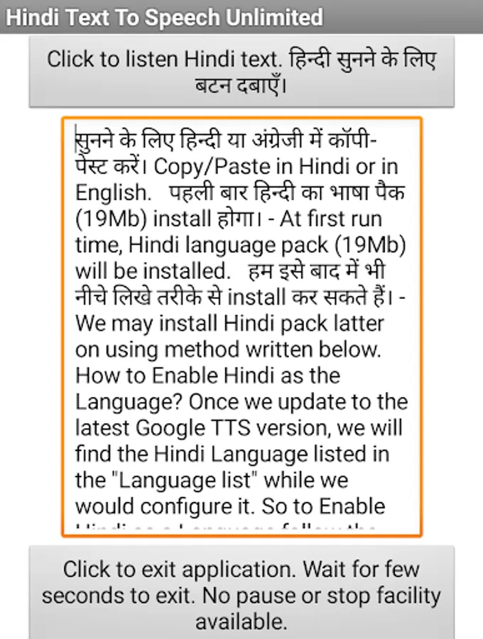 We may now listen long paragraphs of selected texts, even full book at one go. Just Copy-Paste from anywhere - from the web page or any document. Click "Listen button" and listen uninterruptedly. The main motto was to listen full Hindi book or Pravachan - discourse continuously without stop. We may record the voice using another mobile recorder. Your suggestions to improve the app are welcome.