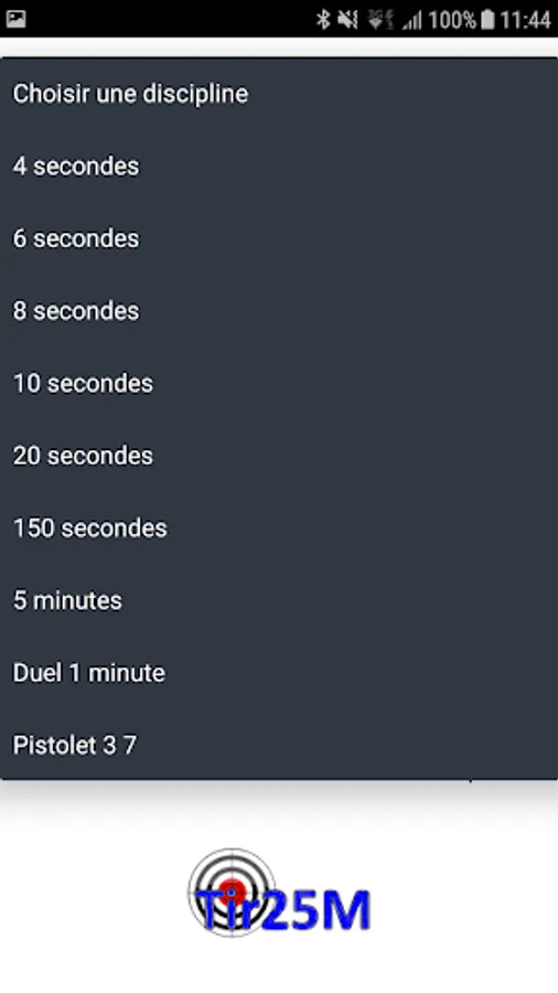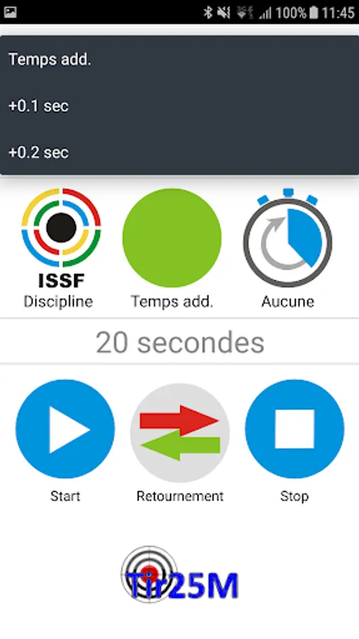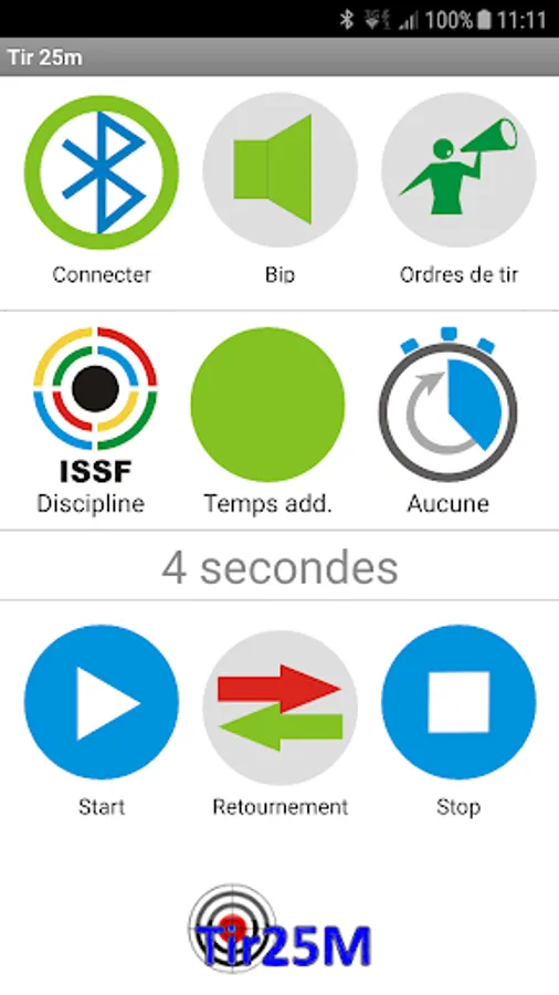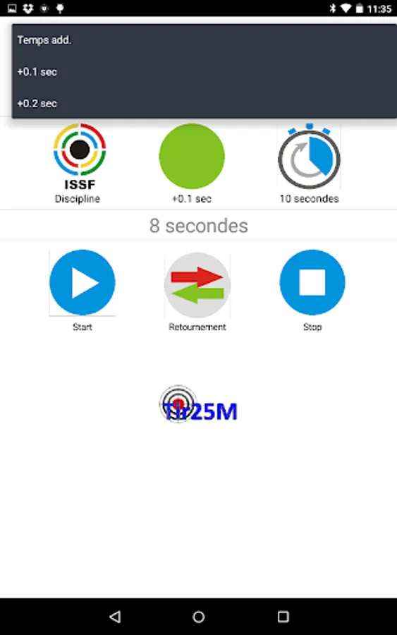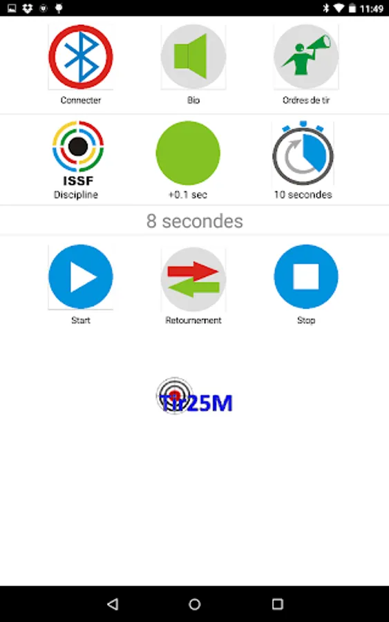 This application is a shot clock showing the different disciplines ISSF 25m pistol (VO, Standard, Combined ...). Bluetooth connected to the dedicated control box, the pilot application of the system Girocible Targetry 25m.