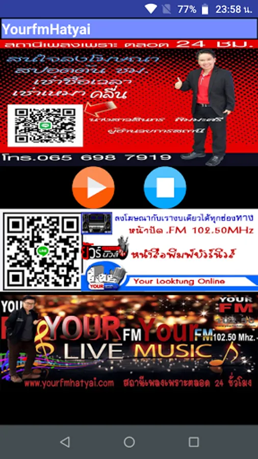 Yourfm Hatyai 102.50 MHz, Hat Yai radio station, a good music station 24 hours a day, passing happiness and be a friend of the listener All activities in daily life While working, resting and traveling, Your FM offers a variety of listening channels. Both on air on the radio 102.50 MHz in Hat Yai district, full area and some areas in Mueang Songkhla District, Na Mom District, Sadao District, Khlong Hoi Khong District via online system on website www.yourfmhatyai.com and Facebook system Book Line at www.facebook/YourFM102.50Hatyai