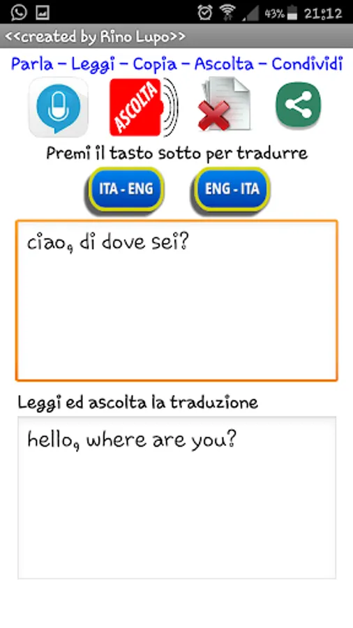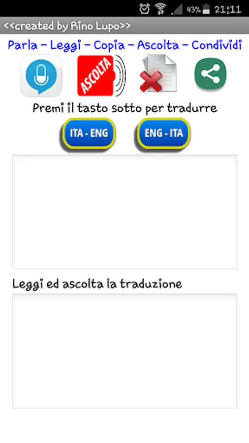 Speak or write in Italian or English, translates in writing or spoken in the chosen language, will translate your voice and you will hear the pronunciation of translated results.