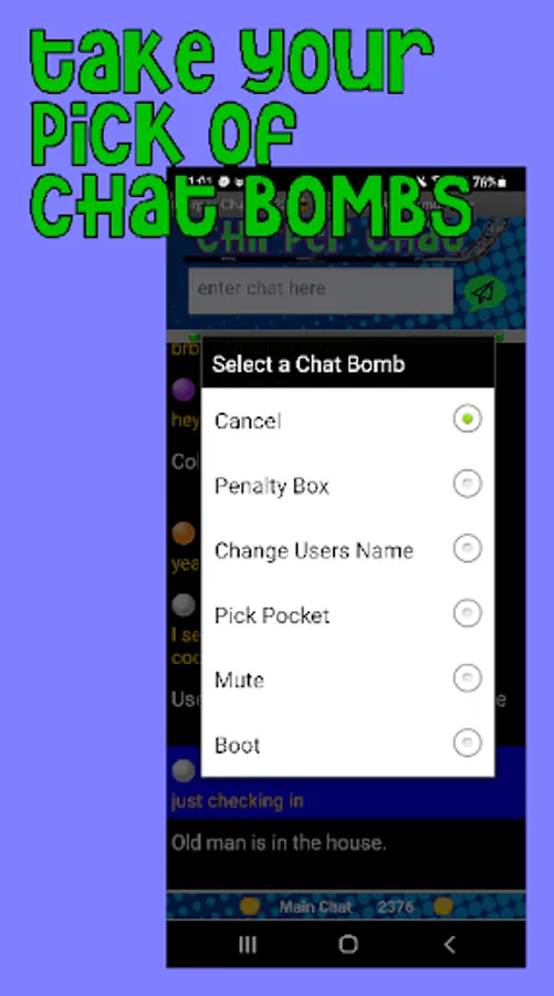 ⭐ It's interactive because you earn points just for using the app. Spend them on Chat Bombs you can toss at your friends. If someone in the chat room is acting a fool, put him in the Penalty Box .. he won't be able to chat until he is released. Or you can force a name change on his account to something less flattering. Also included are Picking Pockets, Mute, and The Boot. Just select the chat message that your friend has posted to open the Chat Bomb menu. Innovative chat room moderation.. It all starts here at Chirper Chat.
