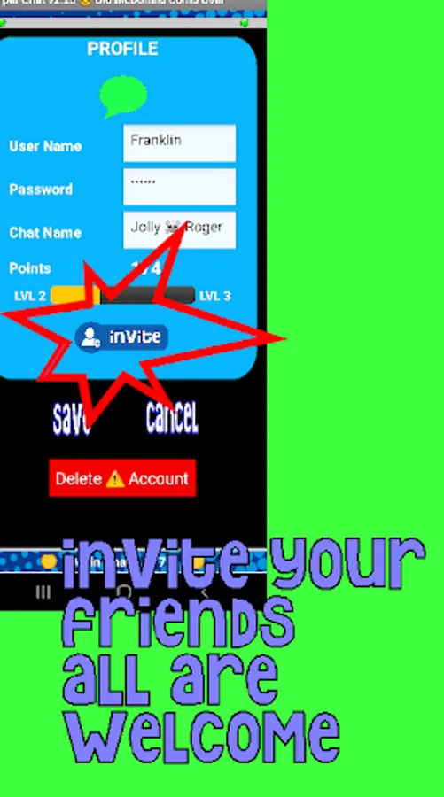 ⭐ Pull the sliding menu out from the left side of the screen to change your chat name, change rooms, or toggle the audio notifications on and off. Turn on Pulse to start your phone's "heartbeat" to keep you active on the chat room network in order to avoid timeouts. When logging off, be sure to use the Save & Exit feature from the menu to save your points.