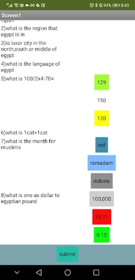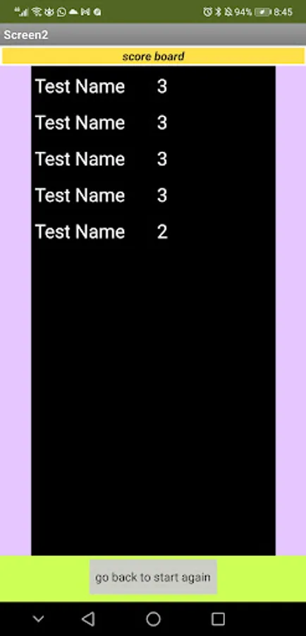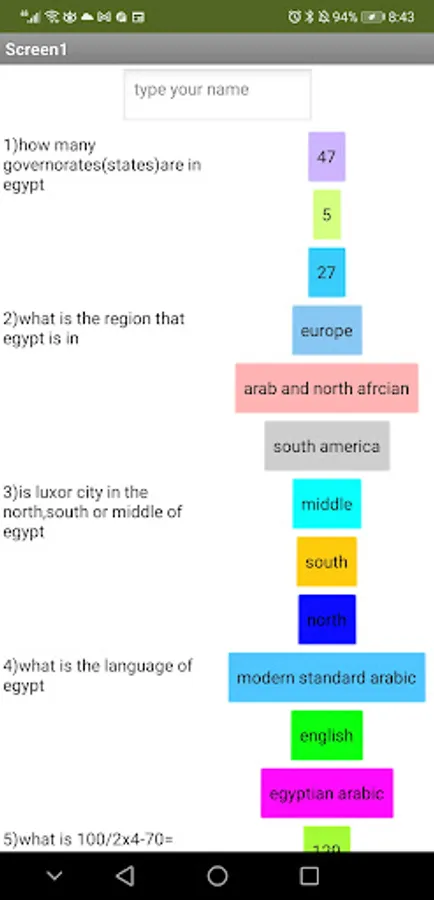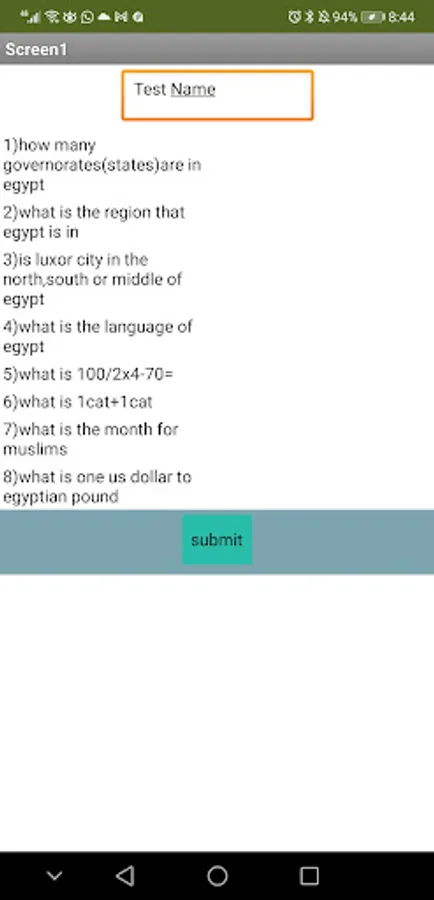 It is an MQA app in which the user will put their name, answer the questions, and submit them. After submission, they will be directed to another screen where there will be a leaderboard with the names of the users that took this quiz and their respective scores next to them.