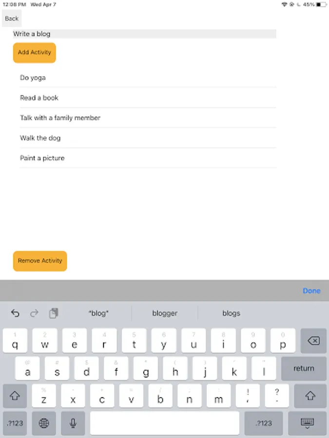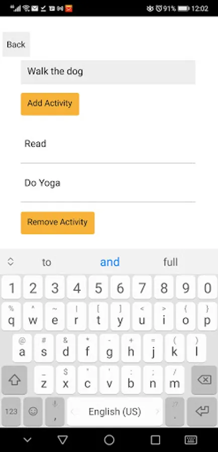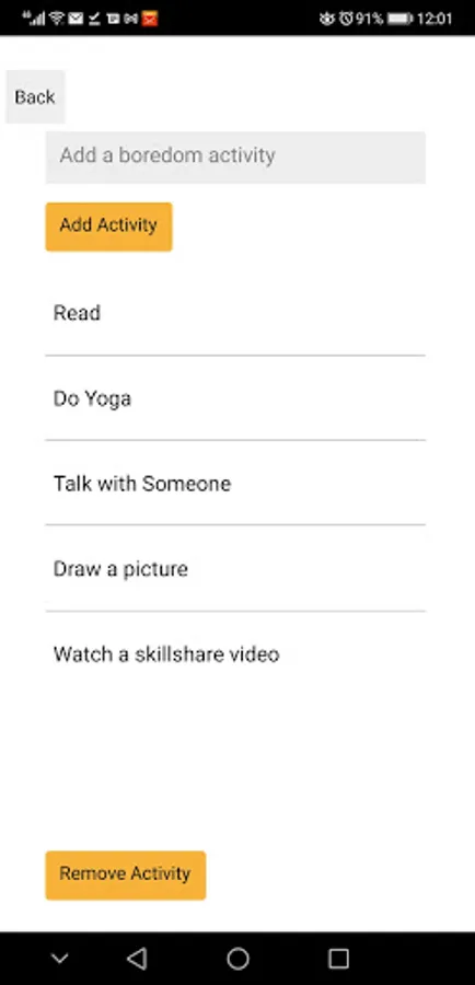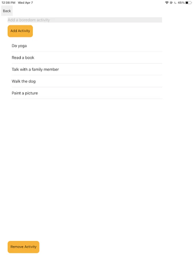 You can create a list of Boredom Activities by clicking on the "Add Boredom Activity" button. You can also remove items from the list.