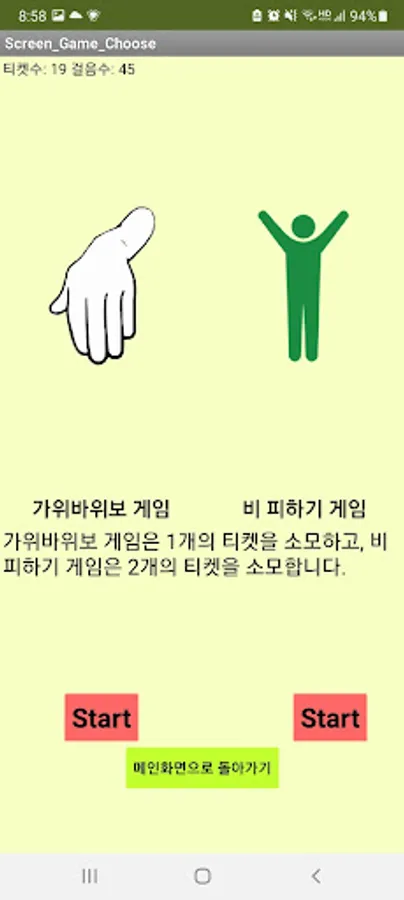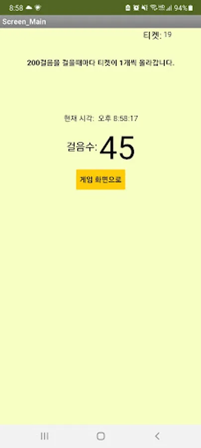 The more you walk, the more your ticket goes up, and you can play games with that ticket. The games include a rock-paper-scissors game and a rain avoidance game. In the rain avoidance game and the rock-paper-scissors game, you can add a song to make it interesting. And it resets at 12 o'clock, so you don't have to worry about numbers.