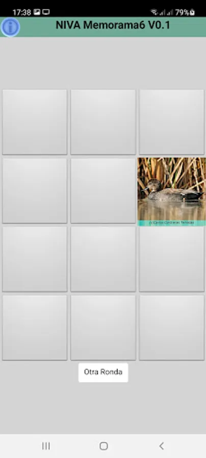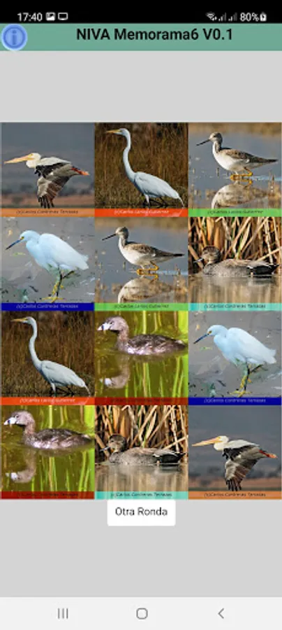 NIVA Memorama6 is a Memorama-type application with 50 images of aquatic and shorebirds from the Laguna de Atotonilco municipality of Villa Corona in the state of Jalisco, Mexico. Each round selects 6 different images from each other to present them to a participant in 6 pairs giving a total of 12 cards that are shown at random.