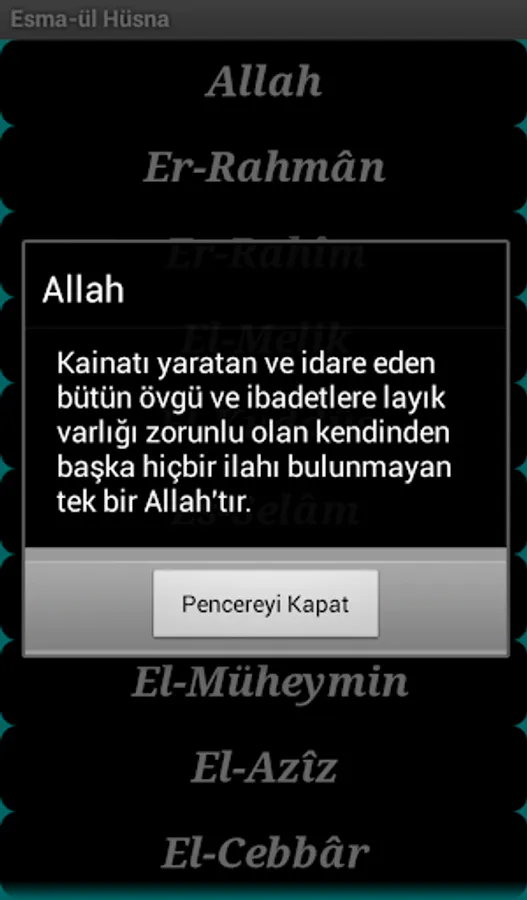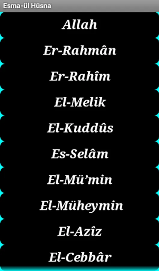 Esma-ul Husna application, Allah (SWT) 's meaning of ESMA is short and catchy, and always has been designed for you to read on your mobile device. Our applications are free of charge and there is no advertising. Butona can open by touching the meaning of ESMA.