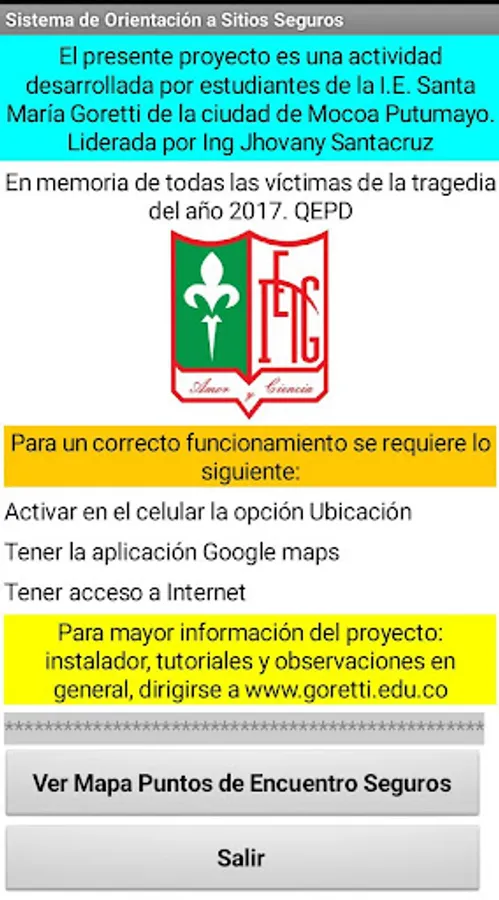 This application was fully developed by 9th grade students of the Santa María Goretti de Mocoa Educational Institution, in the year 2019, and it emerges as a risk prevention measure in case of possible emergencies that may occur in that city.