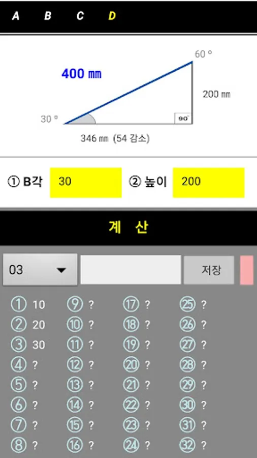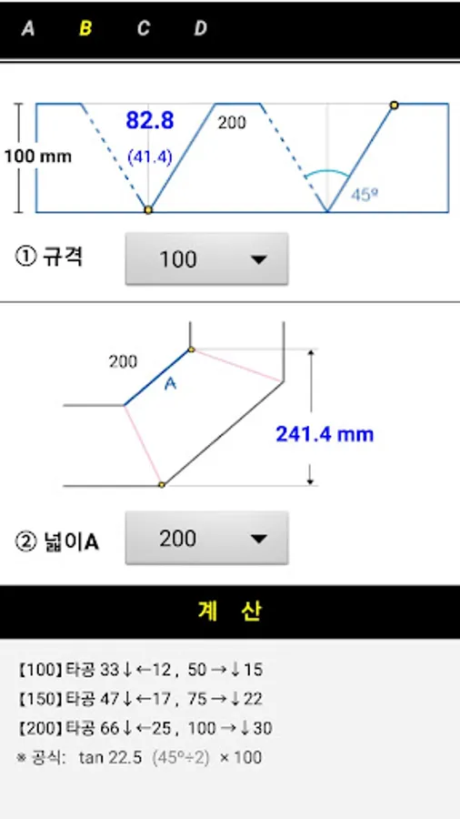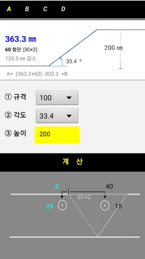 The first a is a screen for processing tray S. If you enter the height after selecting the standard and angle, you can get the hypotenuse value, and you can check the cutting value and perforation value.