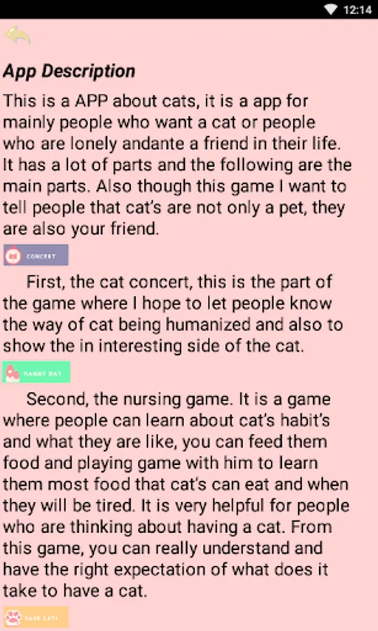 This is a APP about cats, it is a app for mainly people who want a cat or people who are lonely andante a friend in their life. It has a lot of parts and the following are the main parts. Also though this game I want to tell people that cat’s are not only a pet, they are also your friend.