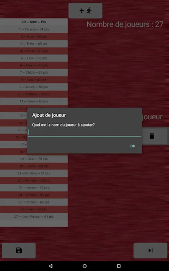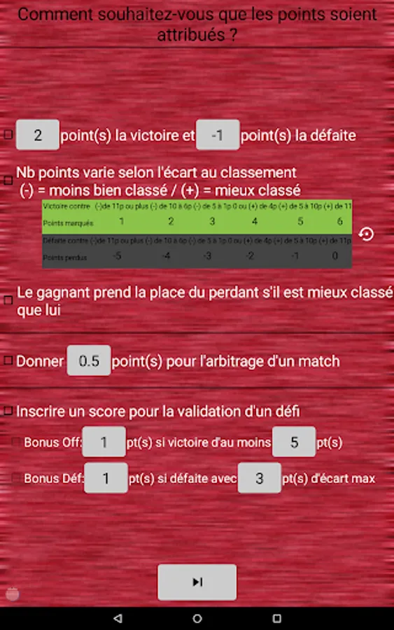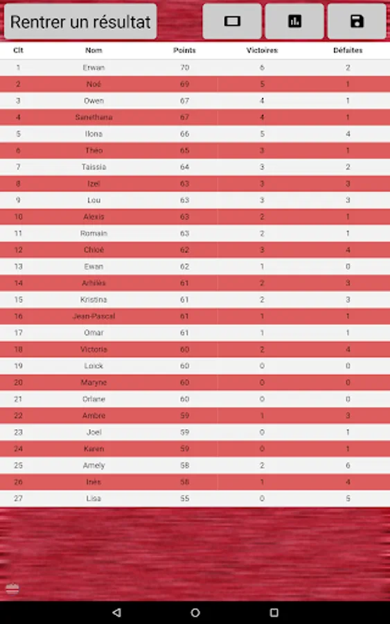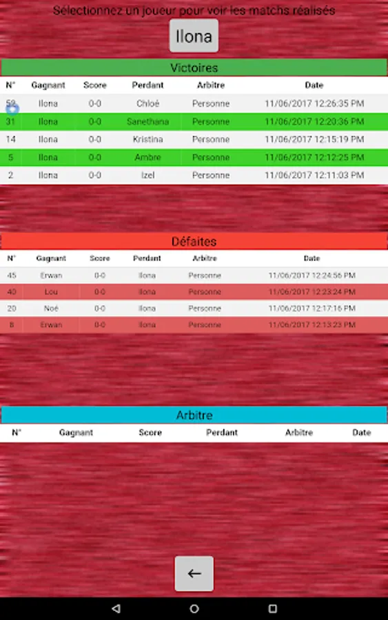 The ranking is automatically updated which allows to know directly the place of each player, the number of points scored, collected, number of games won, lost ...