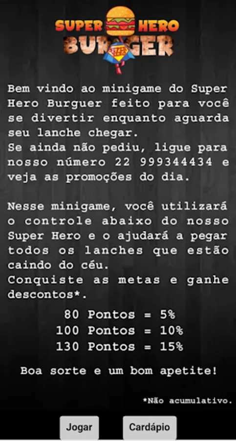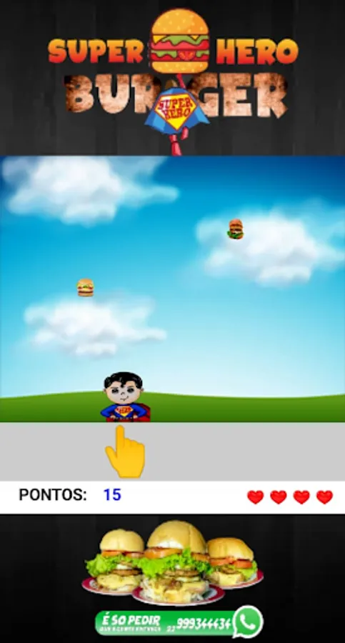 The Super Hero Burger Burger in Macaé besides having the best snack and the best prices, now comes with this novelty to reward its customers with discounts in this fun Mini Game. Help Super Hero to eat all the snacks and get discounts for your orders.