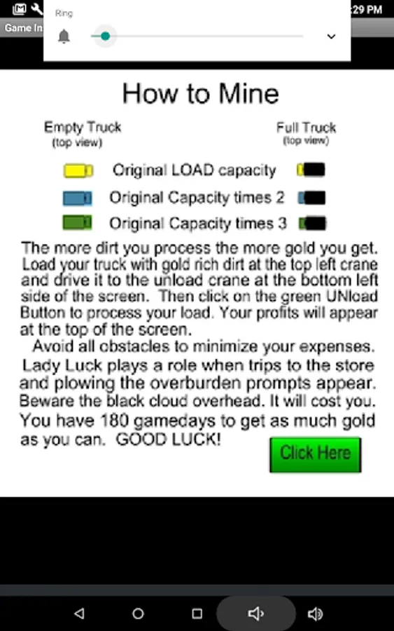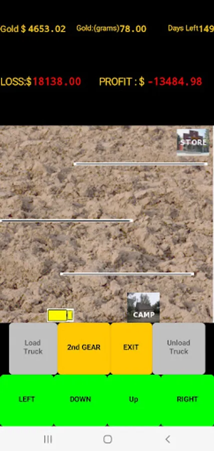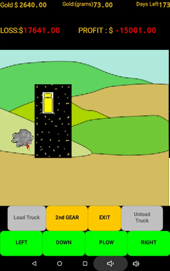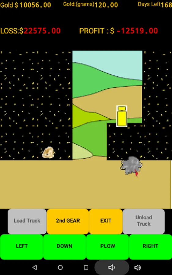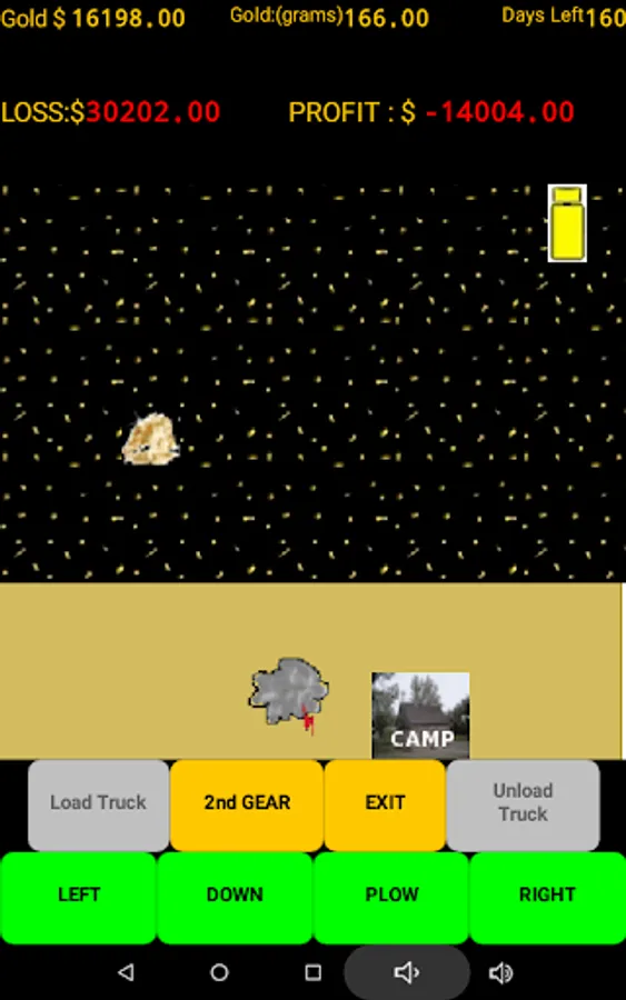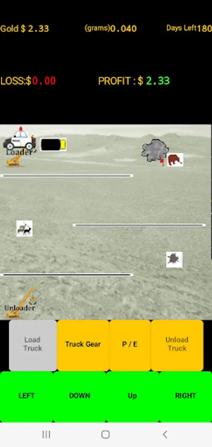 (This offline game version is ad free and does not collect any personal data.) With a short mining season ahead of you, select a location and test pan for gold. When you feel you have found the right spot then begin mining. Load your truck with pay dirt and drive to the processing plant. Beware all the profit eating obstacles that await you. Plowing the overburden can be very rewarding but all those trips to the store and the weather will test your patience. Beware of the many other unexpected expenses that pop up and eat away your time and profits. You have 180 game days (approx. 30 minutes ) to get it done. (A game pause button has been added). Do you have what it takes to be the most profit making gold mining millionaire? GOOD LUCK!
