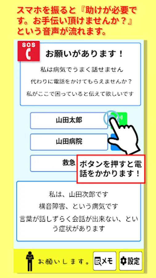 ◆ When you shake your smartphone, the message "I need help. Can you help me? ” will be heard, so you can ask for help from the people around you.