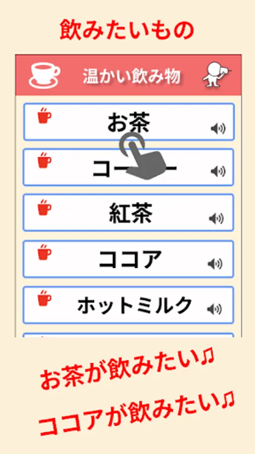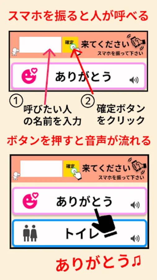 This app is a very simple app that outputs words such as "thank you", "I'm thirsty", and "I want to go to the bathroom" that are often used in everyday life by simply pressing a button.