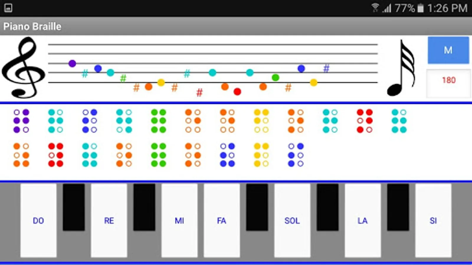 App to create music and learn the theory of Braille musicography, includes all musical notes with duration times, alterations, octaves, ligatures, harmonic intervals, numbers, it also includes piano sound to associate with each note, its equivalent sound on the piano. You can make a list with all the musical figures you want or you can create a score in Braille, It includes a metronome and an ink to Braille converter that allows you to make the mirror effect useful for making transcriptions to paper and punch. Includes options such as Braille Staff and Braille Piano