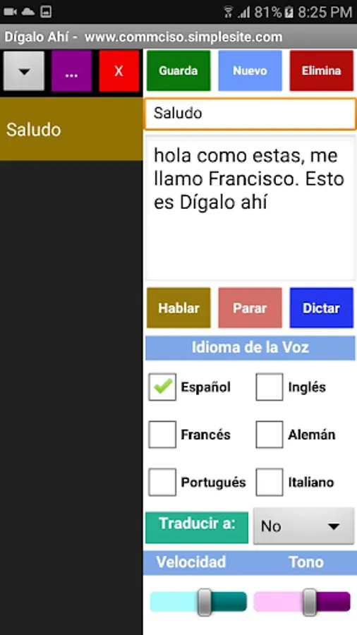 App to help those people who because of their disability cannot express themselves with a voice. It has a list to store in it messages written by the user for everyday use, these messages can be saved in folders, so you can create or delete folders within the App where you store the lists in an orderly way, this way you can have greetings folders , needs folders, or you are simply a speaker and want to organize a speech you could put all the messages in a "Speech" folder. So within a folder you can also manage your messages, that is, modify or delete them. It has 7 check boxes so that you can select in which language the verbalization engine that we include will be expressed, you can also select from a list of 6 languages to translate, that is, your text lists can be translated in real time, it is recommended that the checkboxes match the written text (language in which you wrote the text of each message on your list). We have a "talk" button with this you verbalize what you have in the "Message" text box but if you use the App only to generate translations with voice then you can use the "Dictate" button and in this way the App captures your voice and immediately translates it according to the language selected from the list (not the one selected from the check boxes), at the bottom right you have the sliders to move them and adjust the tone of the voice and the speed to your favorite values (male or female voice) or speak fast or slow.