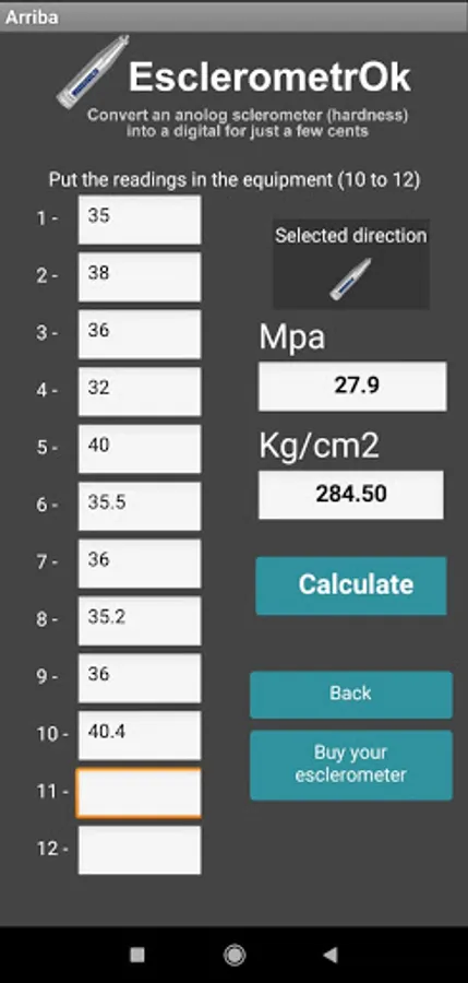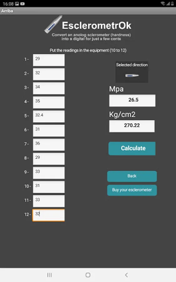 So easy to use, just select in which position the sclerometer is used (up, down, diagonal or horizontal), then place the values of the 10 or 12 readings and voila. You have the results in Mpa and in Kg / cm2.